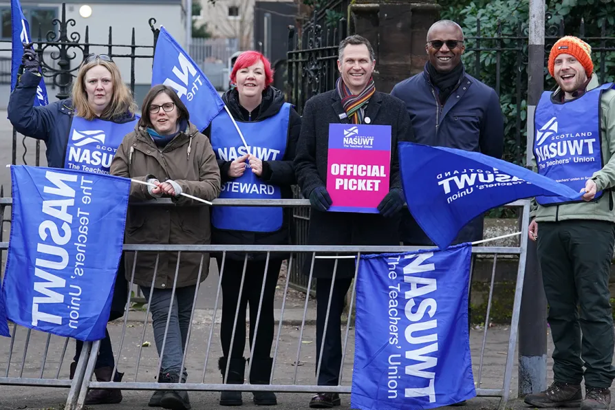 Teachers on a NASUWT picket line outside Wellshot Primary School in Glasgow with then NASUWT general secretary Dr Patrick Roach (second right), March 1, 2023