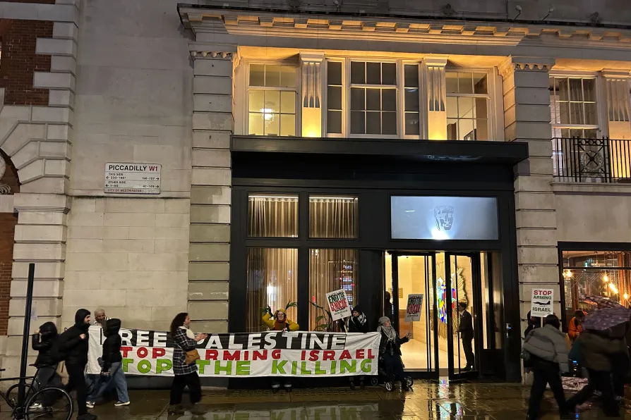 Members of the Palestine Solidarity Campaign (PSC) met with placards and megaphones outside the event, which they discovered hours before the start would be in a building where the Baftas are usually held in Mayfair.