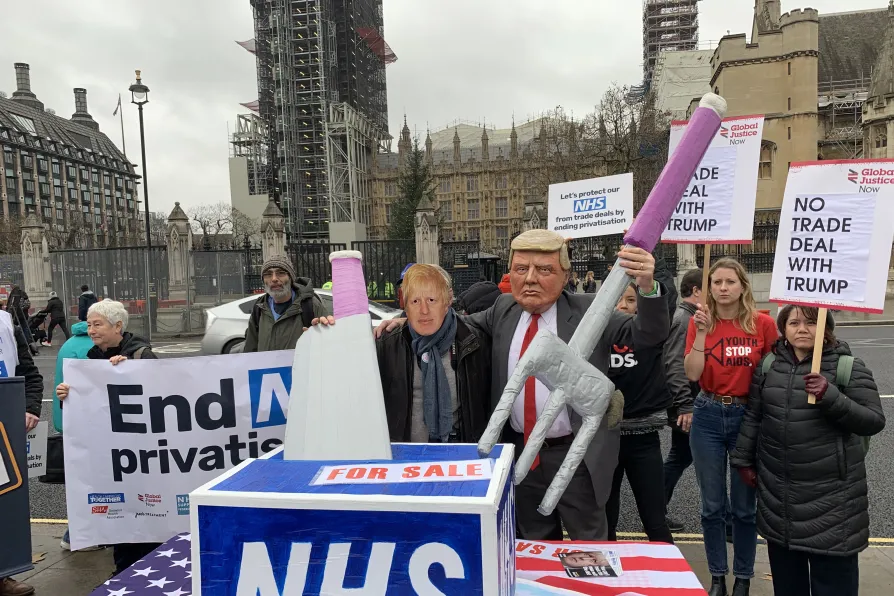 We Own It, Global Justice Now, Keep Our NHS Public, and Health Campaigns Together protest outside Parliament highlighting the risks of a Tory-Trump trade deal