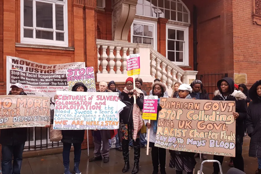 THE Jamaican high commission in London was besieged today by dozens of angry demonstrators demanding that diplomats halt the first mass deportation to the Caribbean since the Windrush scandal erupted.