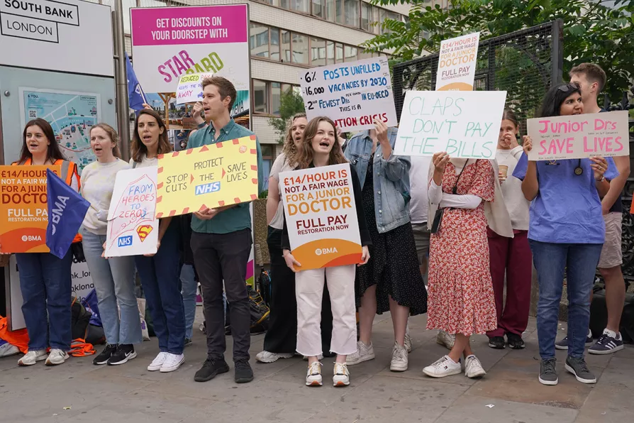 Junior doctor members of the British Medical Association (BMA) on the picket line outside St Thomas' Hospital, London, at the start of a five-day strike amid the continuing dispute over pay, the longest walkout of its kind in the history of the NHS, Thursday July 13, 2023