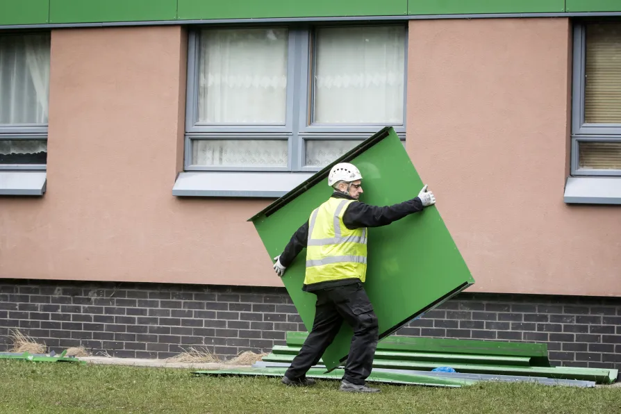 Cladding is removed from Hanover tower block in Sheffield, Yorkshire, in June 2017