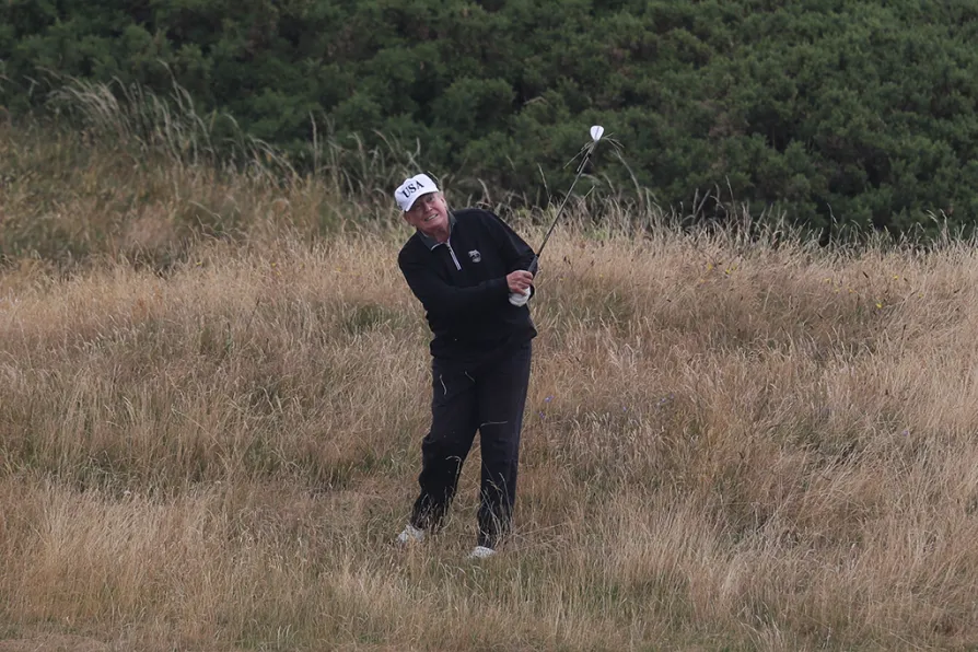 US President Donald Trump takes a shot from the rough on his golf course at the Trump Turnberry resort in South Ayrshire