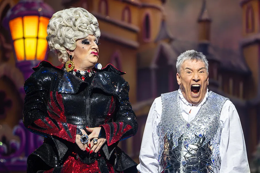 Staged in Ian Westbrook’s sparkly primary-coloured sets, there’s a raucous familiarity to much of the proceedings. Within the first 30 minutes the front rows have been squirted with water. The audience has booed, hissed, and shouted “he’s behind you.” Irreverent jokes have been made about politicians and ex-royals.