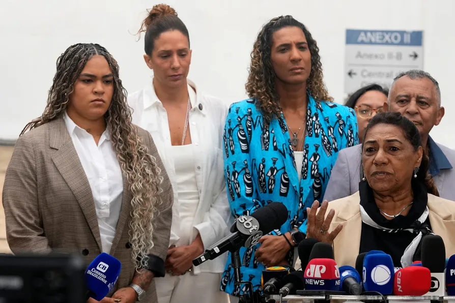 Marinete Silva, mother of councilwoman Marielle Franco (right) gives a news conference with her family at the Supreme Court on the first day of the trial of those accused of ordering her daughter's murder, in Brasilia, Brazil, February 24, 2026