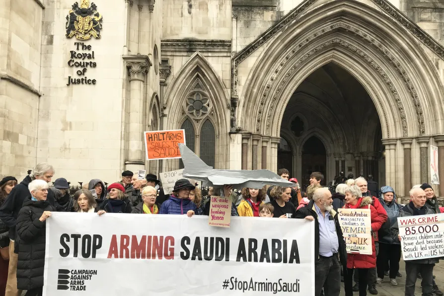 Campaigners outside the Royal Courts of Justice, London ahead of a three-day legal challenge over the British government's exports of arms to Saudi Arabia, today