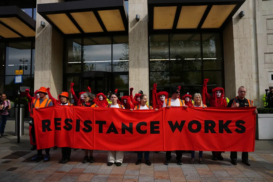 Protesters from Just Stop Oil outside the Shell Centre on the South Bank, take part in what it claims will be their last direct action protest in central London, April 26, 2025