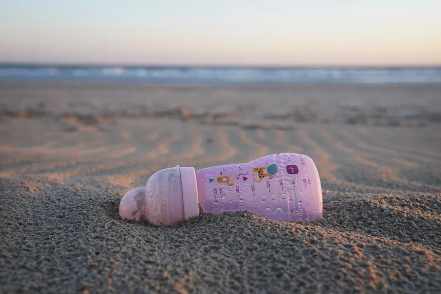 A baby feeding bottle on the beach in Gravelines, France, after being dropped as people thought to be migrants continue to scramble for small boats in a bid to reach Britain, July 3, 2025