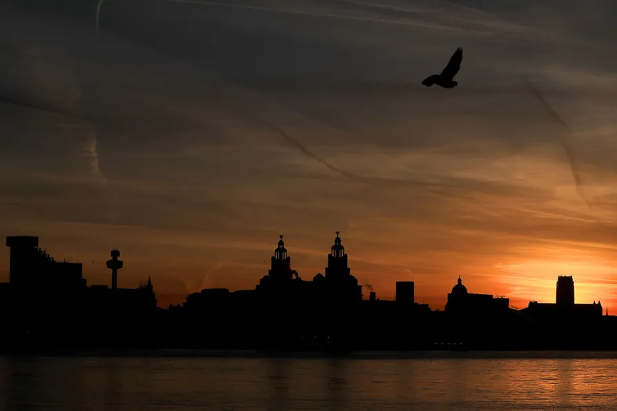A view of the River Mersey and the city skyline, with the Royal Liver Building at centre, as the sun rises over Liverpool, October 2017