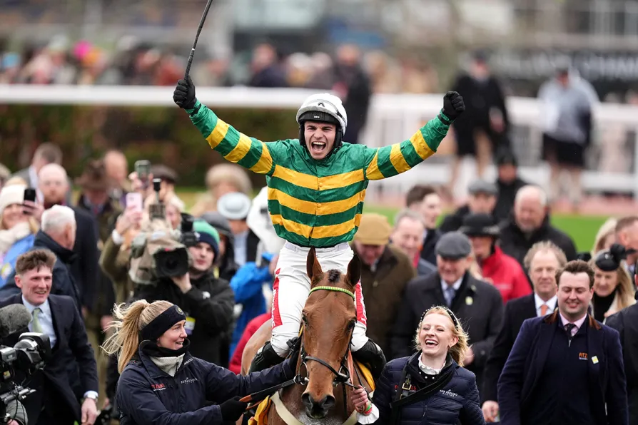 Meetmebythesea and jockey Ben Jones celebrate after winning the Jack Richards Novices' Limited Handicap Chase on day three of the 2026 Cheltenham Festival at Cheltenham Racecourse, March 12, 2026