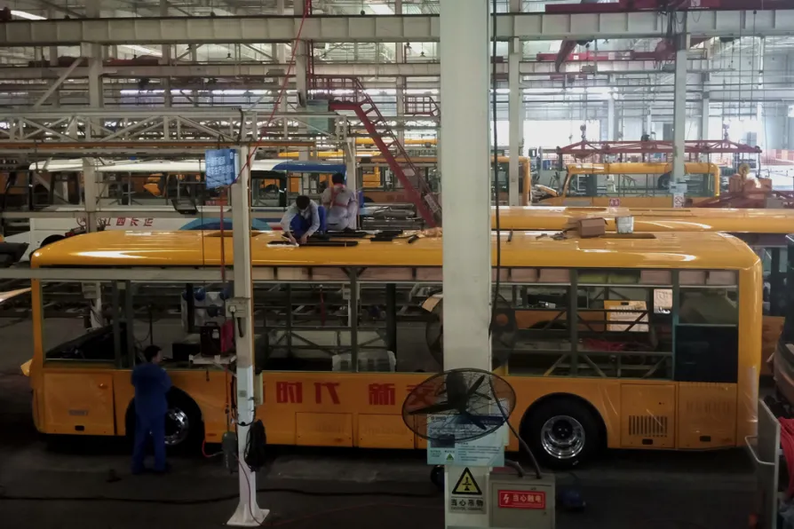 Workers assemble electric buses at a factory in Liaocheng city in east China's Shandong province