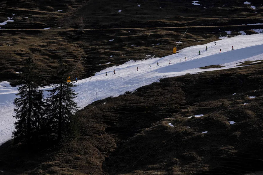 People ski on a hill with manufactured snow near Bayrischzell, Germany, February 6, 2024