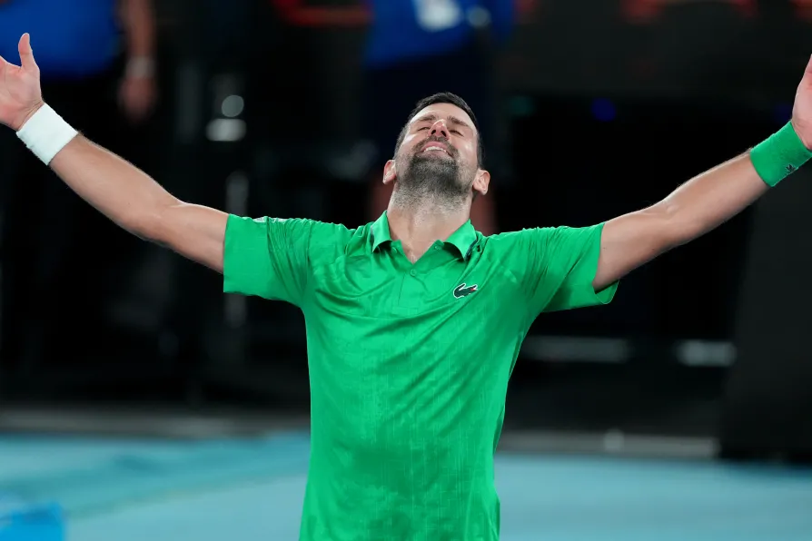 Novak Djokovic of Serbia celebrates after defeating Jannik Sinner of Italy in their semifinal match at the Australian Open tennis championship in Melbourne, Australia, January 31, 2026