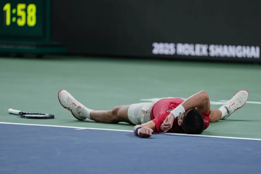NOVAK DJOKOVIC collapsed on court at the Shanghai Masters today, before recovering to beat Jaume Munar.