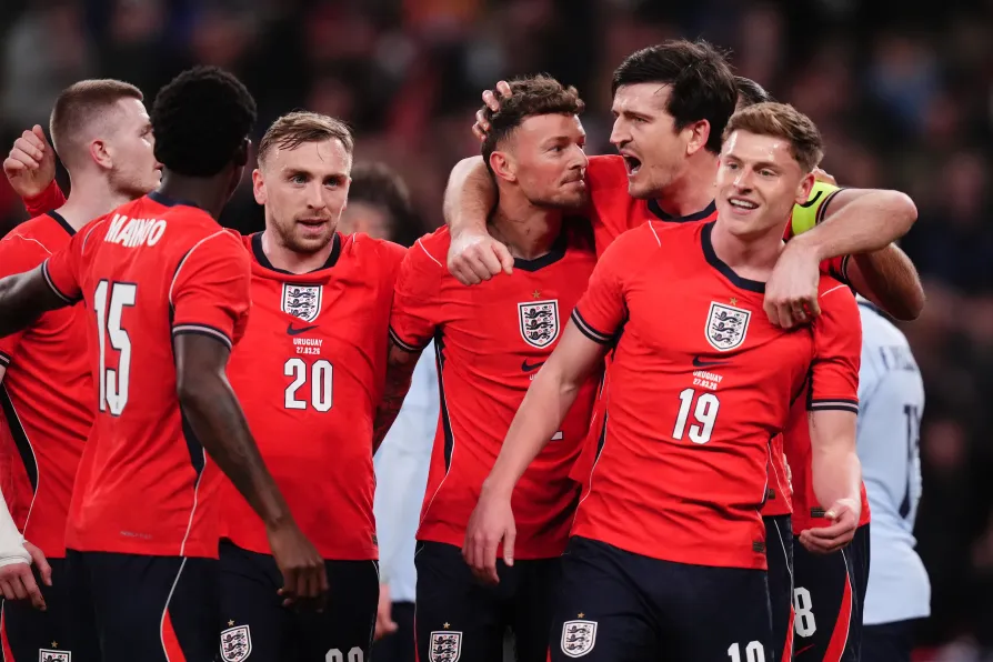 England's Ben White as he celebrates scoring the opening goal against Uruguay with team mates, March 27, 2026