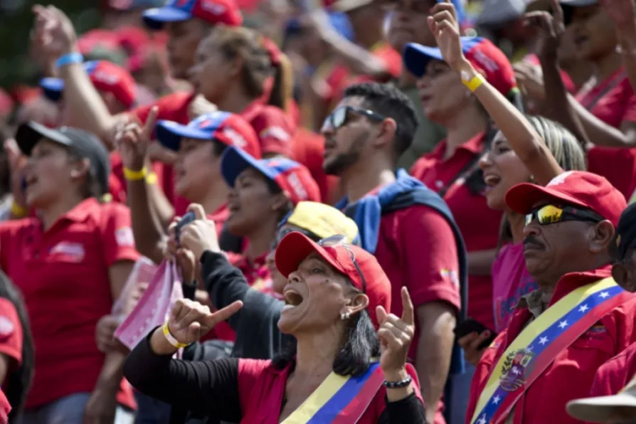 People chant during a rally celebrating May Day in Caracas, Venezuela, on Monday