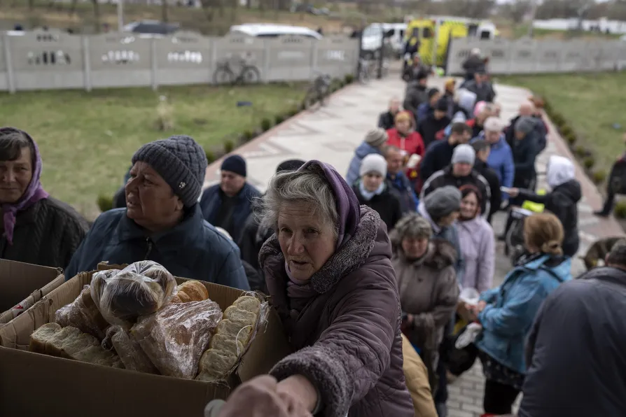 People receive food from a church in the town of Borodyanka, about 40 miles northwest of Kiev, Ukraine, on Sunday April 10 2022