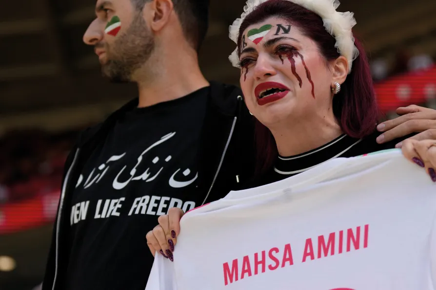 An Iranian holds up the name of the young woman who died at the hands of the 'morality police' while a male protester displays the ‘women, life, freedom’ slogan of the uprising, before the start of the World Cup match with Wales in Qatar, November 25.