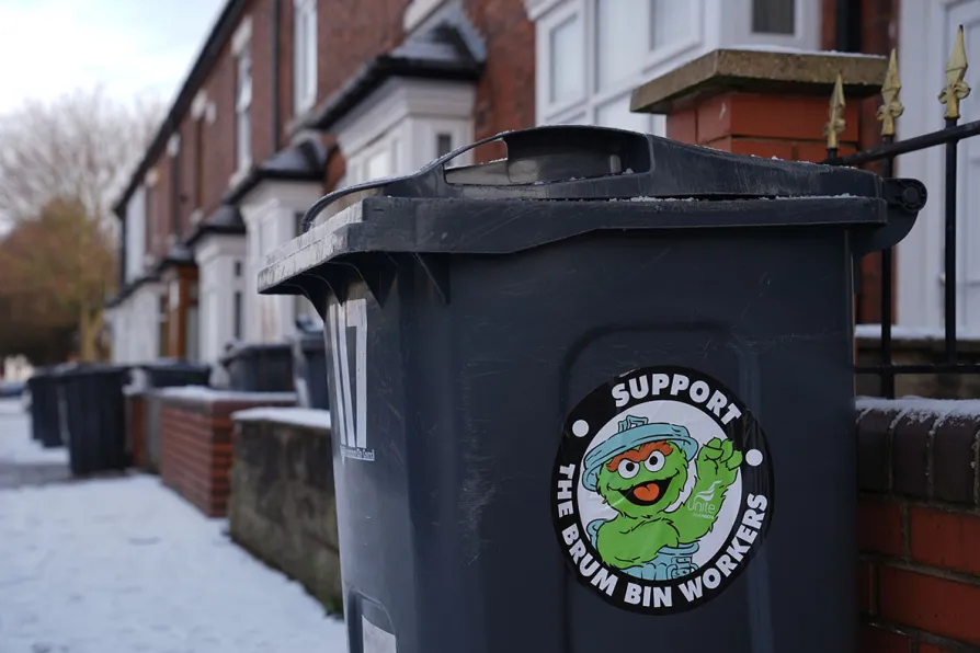 A sticker supporting the strikes on a bin as agency refuse workers collect rubbish in the Saltley area of Birmingham, January 6, 2026