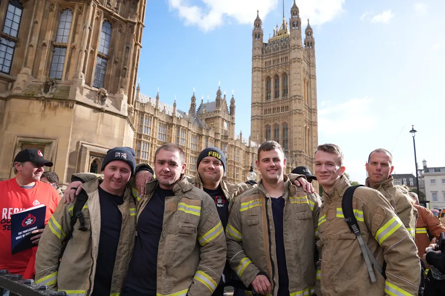 Members of the Fire Brigades Union (FBU) during a rally outside the Houses of Parliament in central London, calling for more investment in the fire service, October 8, 2024