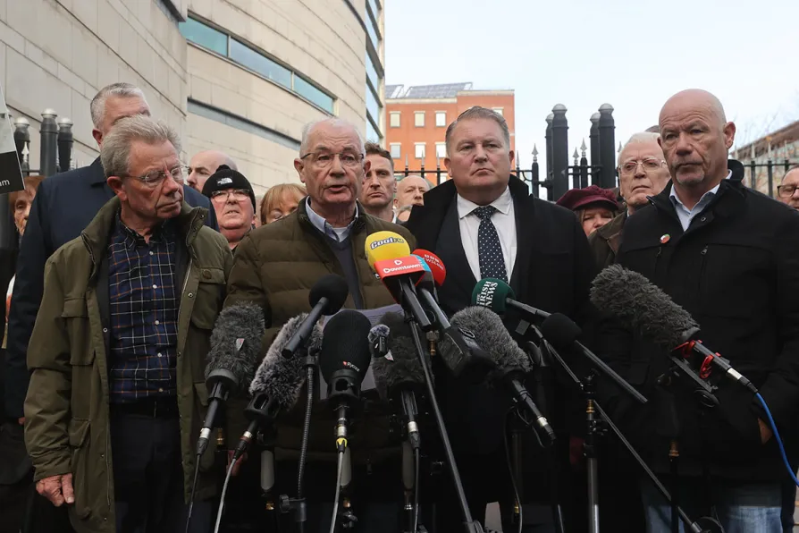 The brothers of Bloody Sunday victim William McKinney and their solicitor, (left to right) Joe, Mickey, solicitor Ciaran Shiels from Madden & Finucane, and John, speak to the media outside Belfast Crown Court, October 23, 2025
