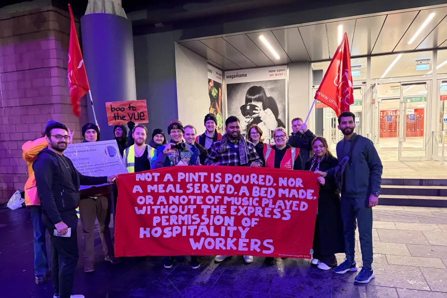 STRIKING workers at Vue Cinema in Glasgow’s St Enoch’s Centre staged a midnight picket, as they battle for better pay, terms and conditions.