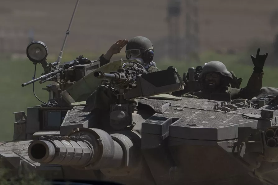 Israeli soldiers move on the top of a tank near the Israeli-Gaza border, March 20, 2024