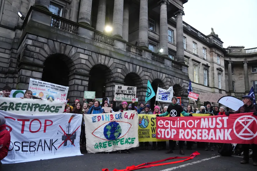 Climate activists from Greenpeace and Uplift during a demonstration outside the Scottish Court of Session, Edinburgh, on the first day of the Rosebank and Jackdaw judicial review hearing, November 12, 2024
