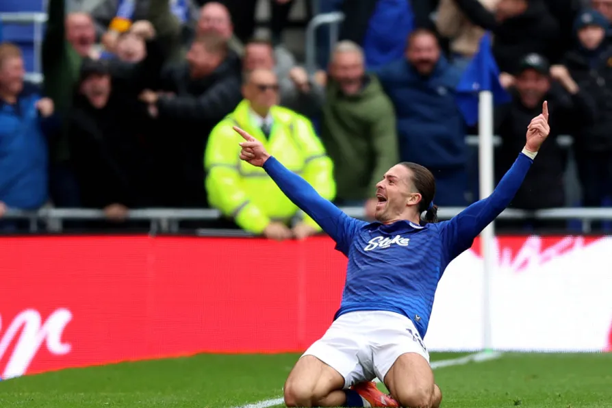 Everton's Jack Grealish celebrates after scoring his sides second goal during the Premier League match at Bramley-Moore Dock, Liverpool, October 5, 2025