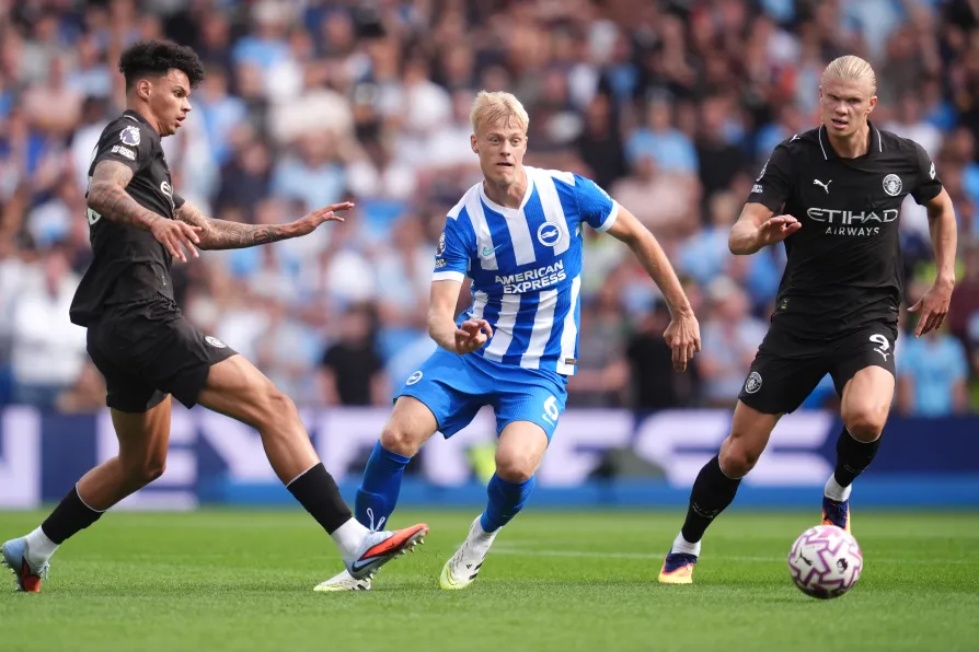 After Yankuba Minteh was dispossessed by Rayan Ait-Nouri and Oscar Bobb drove towards Brighton’s 18-yard box, Omar Marmoush bundled his way past Jan Paul van Hecke and poked through the legs of Lewis Dunk for Haaland to clinically lift the ball over Verbruggen.