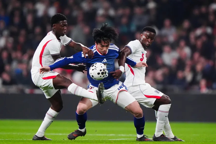 England's Kobbie Mainoo and Marc Guehi battle with Japan's Ayase Ueda (centre) during the international friendly match at Wembley Stadium, London, March 31, 2026