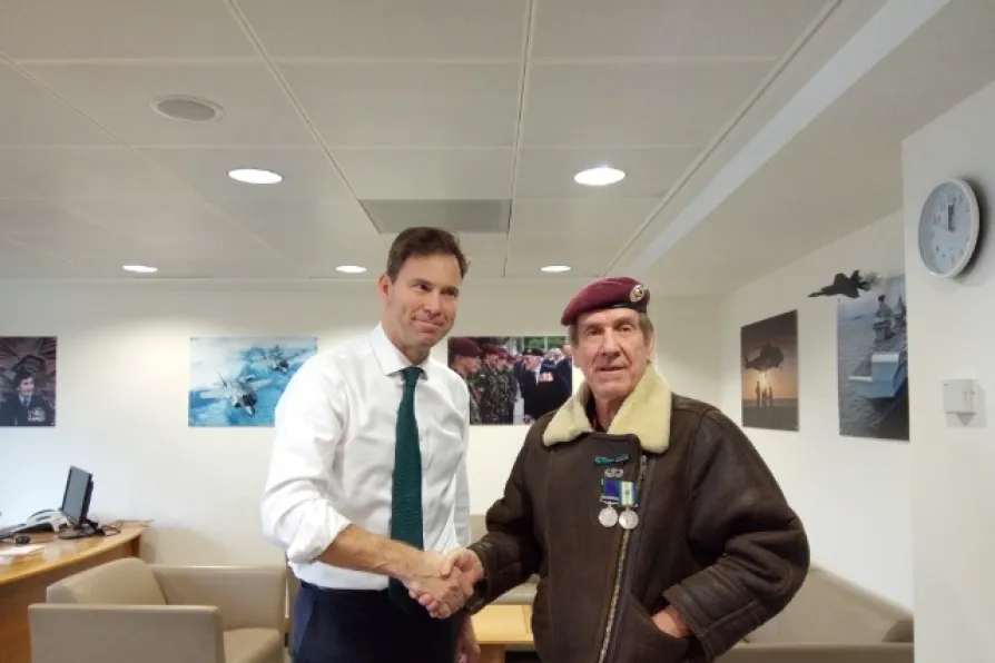 Campaigner and veteran Gus Hales meets with Tory Veterans’ Minister Tobias Ellwood at the Ministry of Defence today