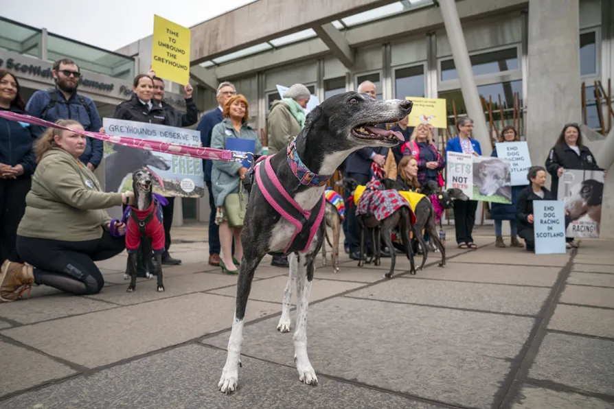 Former racing greyhounds with their owners and members from Unbound the Greyhound Coalition outside the Scottish Parliament in Edinburgh ahead of a bill being officially lodged to ban greyhound racing in Scotland, April 23, 2025