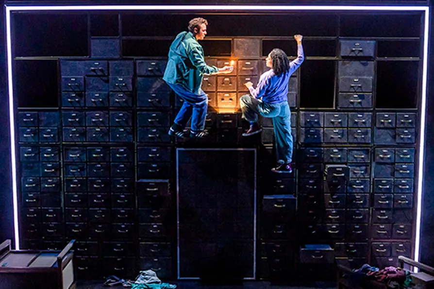 Against designer Simisola Majekodunmi’s ingenious, adaptable wall of brown filing cabinet-style drawers topped by asymmetrical frosted windows, the lovers drag out different memories as they gracefully climb, twist and turn up and down, back through the stages of their relationship.
