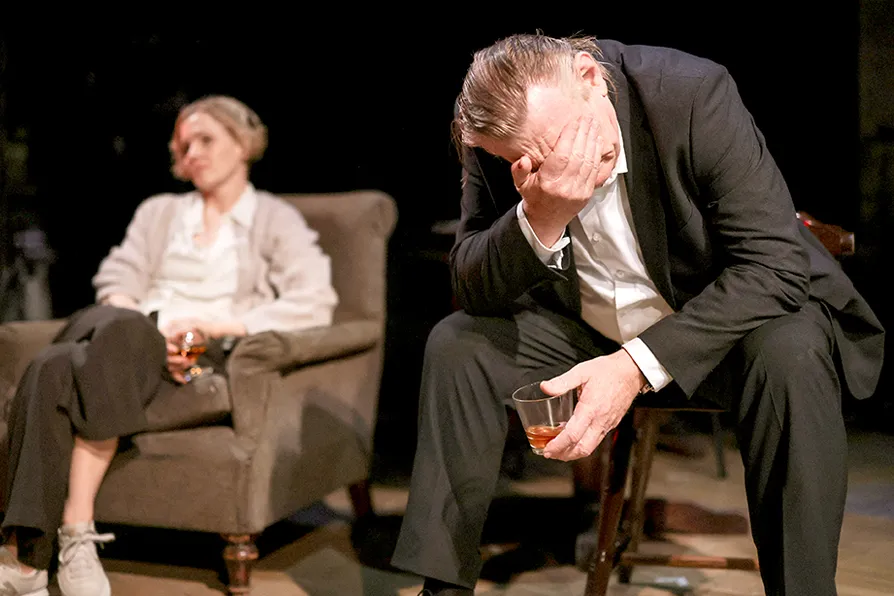 The play transports us body and soul to an out-in-the-sticks pub in Co Leitrim, where publican/barman Brendan (Owen McDonnell) casually serves the same old drinks to the same old punters. As the show opens, Gleeson’s Jack is already in situ, like he’s been there forever: the soul of every Irish pub since records began. It’s as if this pub, its landlord, its rarified clientele, its fading pictures and rickety chairs have metamorphosed organically from the fields and peat bogs, from the rivers and woodlands … indeed from the weir, itself, that colours conversation and is the title of the play.