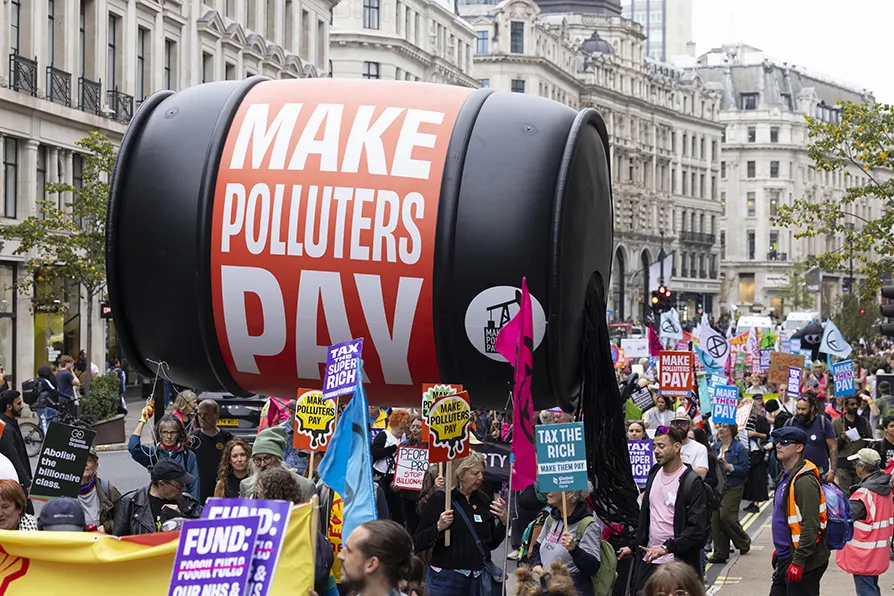 POLLUTERS PUT ON NOTICE: Marchers call on government to force billionaires and fossil fuel companies to contribute financially to climate action ahead of the 2025 UN Climate Change Conference and UK Autumn Budget, September 20 2025