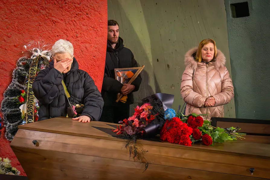 A mother cries at the coffin of her son and soldier, Yukhym Agafontsev, 22, killed in a battle with the Russian troops, during a farewell ceremony in Kyiv, Ukraine, December 2, 2025