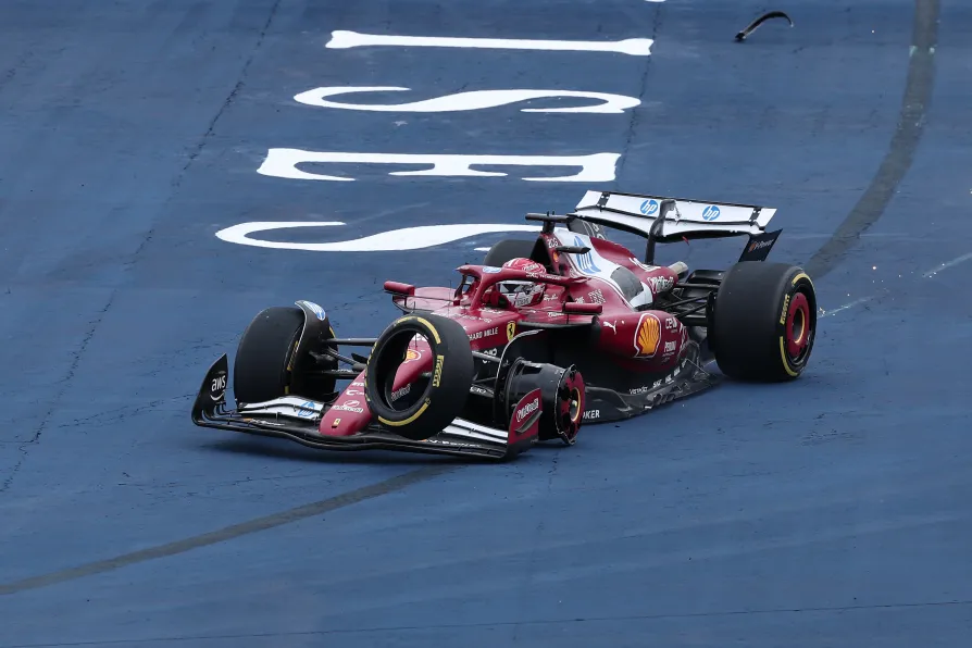 Ferrari driver Charles Leclerc of Monaco loses a tyre during the Brazilian Formula One Grand Prix at the Interlagos race track, in Sao Paulo, November 9, 2025