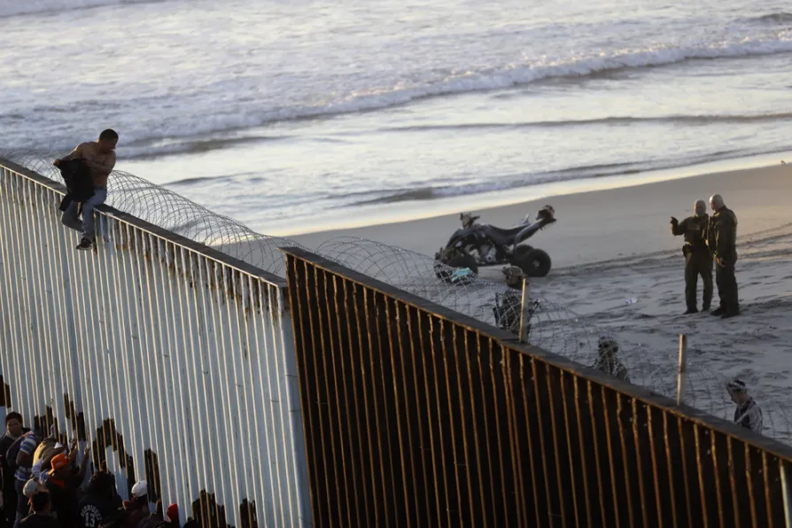 A Central American migrant sits on top of the border structure separating Mexico (left) and the United States (right) as US Border Patrol agents look on, yesterday