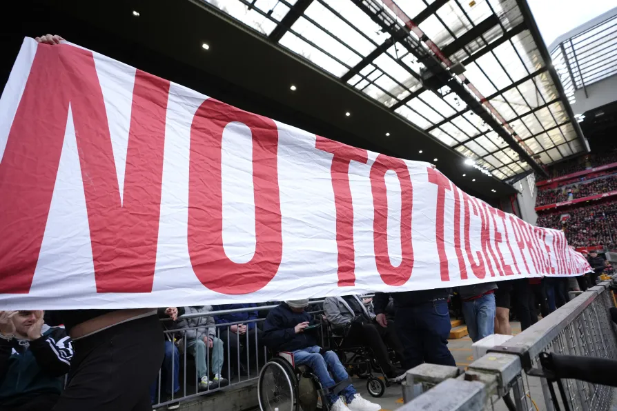 Liverpool fans in the stands protest ticket price increases during the Premier League match at Anfield, Liverpool, April 11, 2026