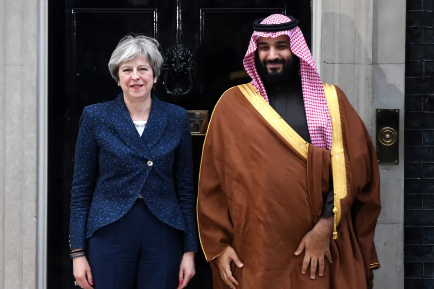 Saudi Arabia's crown prince Mohammad bin Salman is greeted by Prime Minister Theresa May at 10 Downing Street, last March
