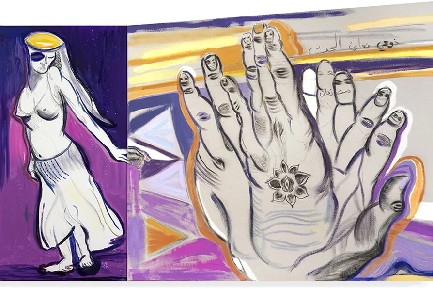 Al Solh’s keen interest in music and its “impact on the soul,” is at the heart of some of the other rooms with her celebrated, three-dimensional triptych — Flying, Clapping, Grooving, Tasting Love, Drieluik — being a representation of clapping as fundamental to Arabic music. A vivid depiction of solitary dancers lost in movement and a hand of many fingers is again streaked with strong colours such as the royal purple originally from Murex shells and vital to Phoenician trade.