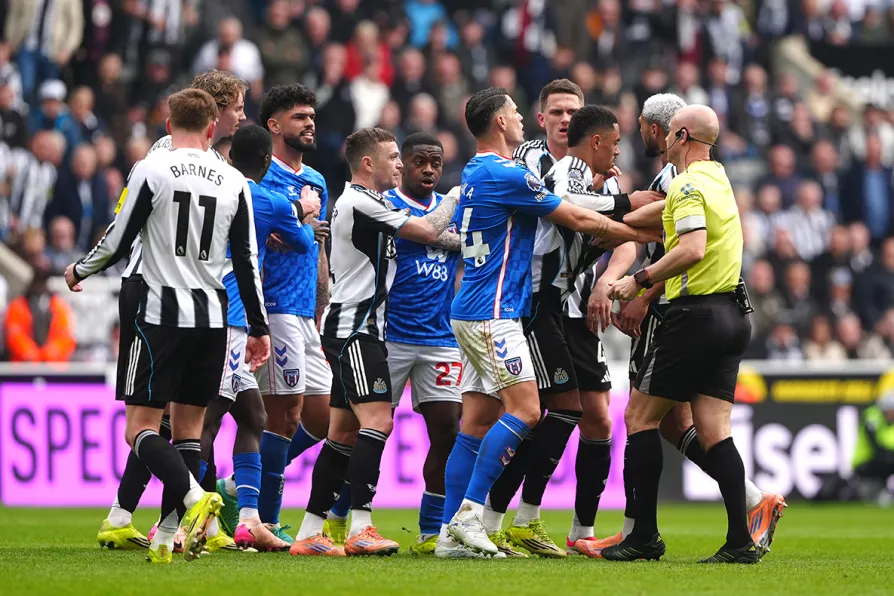 Newcastle United and Sunderland players clash as referee Anthony Taylor attempts to intervene during the Premier League match at St James' Park, Newcastle upon Tyne, March 22, 2026