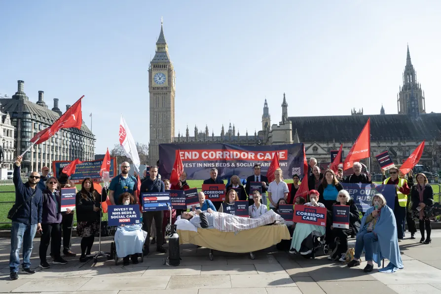NHS staff hold protest outside Parliament demanding end to corridor care