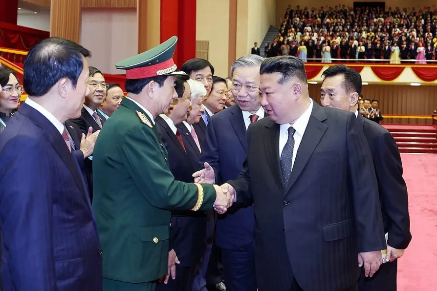North Korean leader Kim Jong Un (front right) shakes hands with Vietnamese Defense Minister Phan Van Giang in Pyongyang, North Korea, October 9, 2025