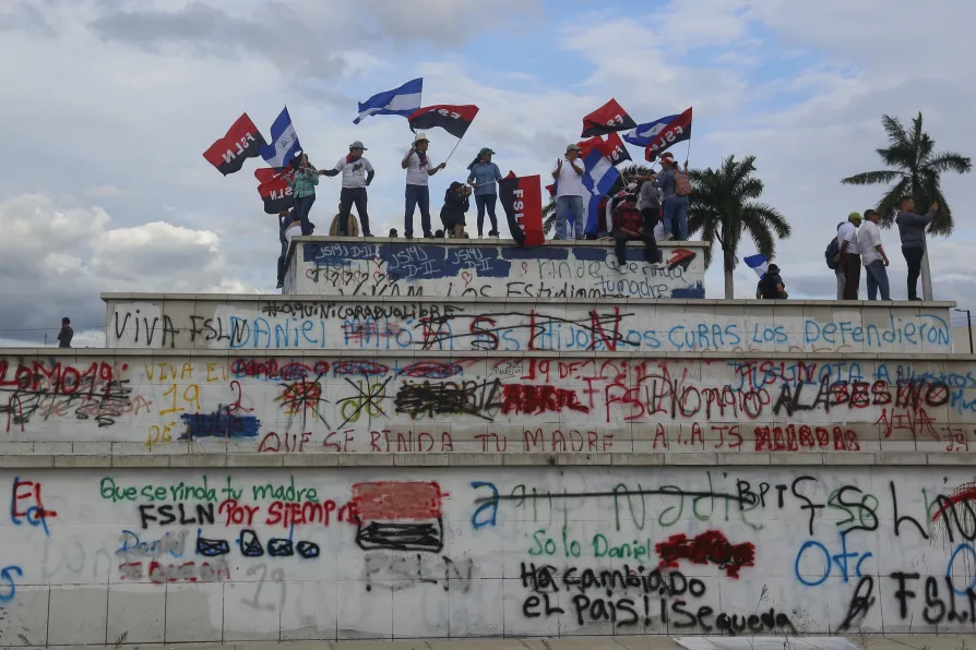 Government supporters wave Sandinista flags on top of the Metro Center roundabout during a pro-government march in Managua, Nicaragua, in September 2018