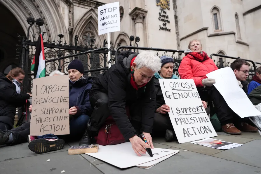 Protesters write on placards outside the High Court, central London, February 13, 2026