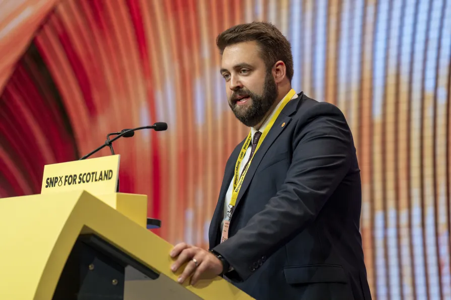 Plaid Cymru's Luke Fletcher speaks with delegates during the SNP annual national conference at the Edinburgh International Conference Centre, September 1, 2024