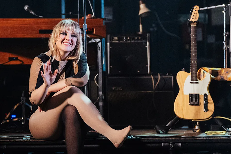 Before the play begins Arthur sits upon stage with his back to the audience, smoking cigarettes. Simple effects like lights and moving platforms allow for fast set changes, working to give the impression of the audience being at the gig when the band perform their music. This softened fourth wall is used to emphasise the play’s critique of the period.