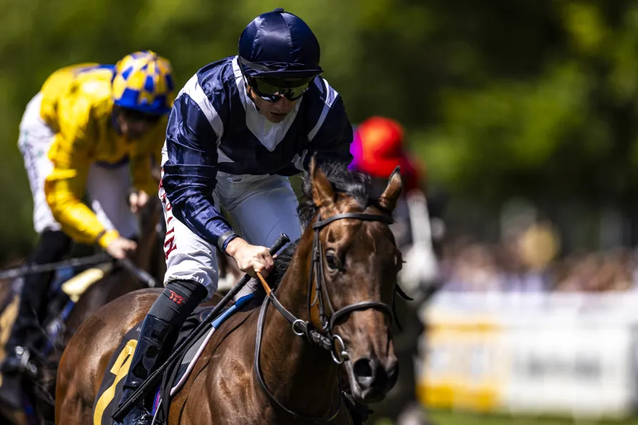 Rumstar ridden by Rob Hornby on their way to winning the Hong Kong Jockey Club World Pool Palace House Stakes on 2000 Guineas Day of the Betfred Guineas Festival at Newmarket Racecourse, Suffolk, May 3, 2025